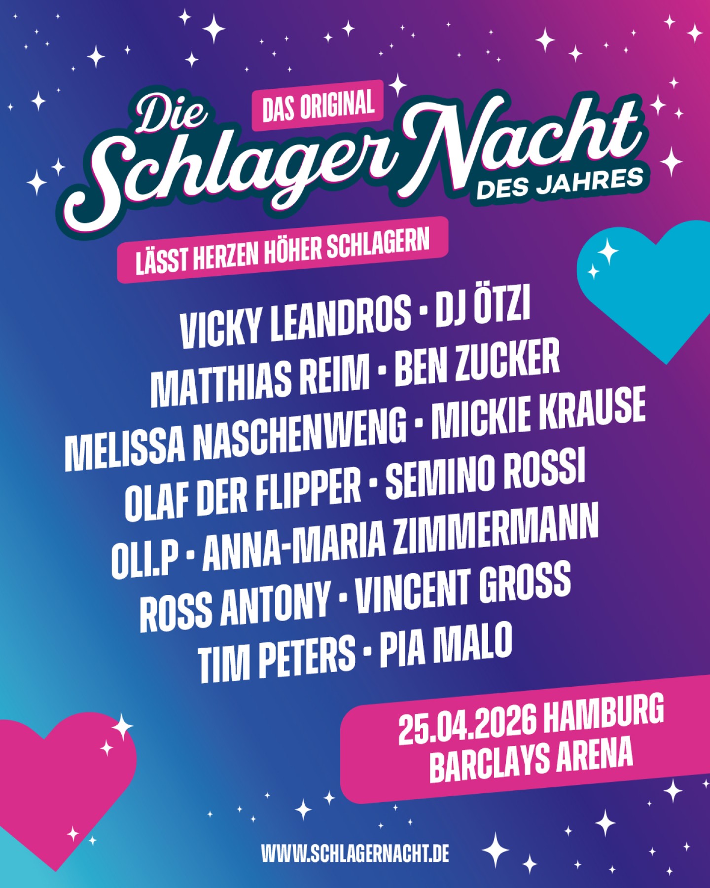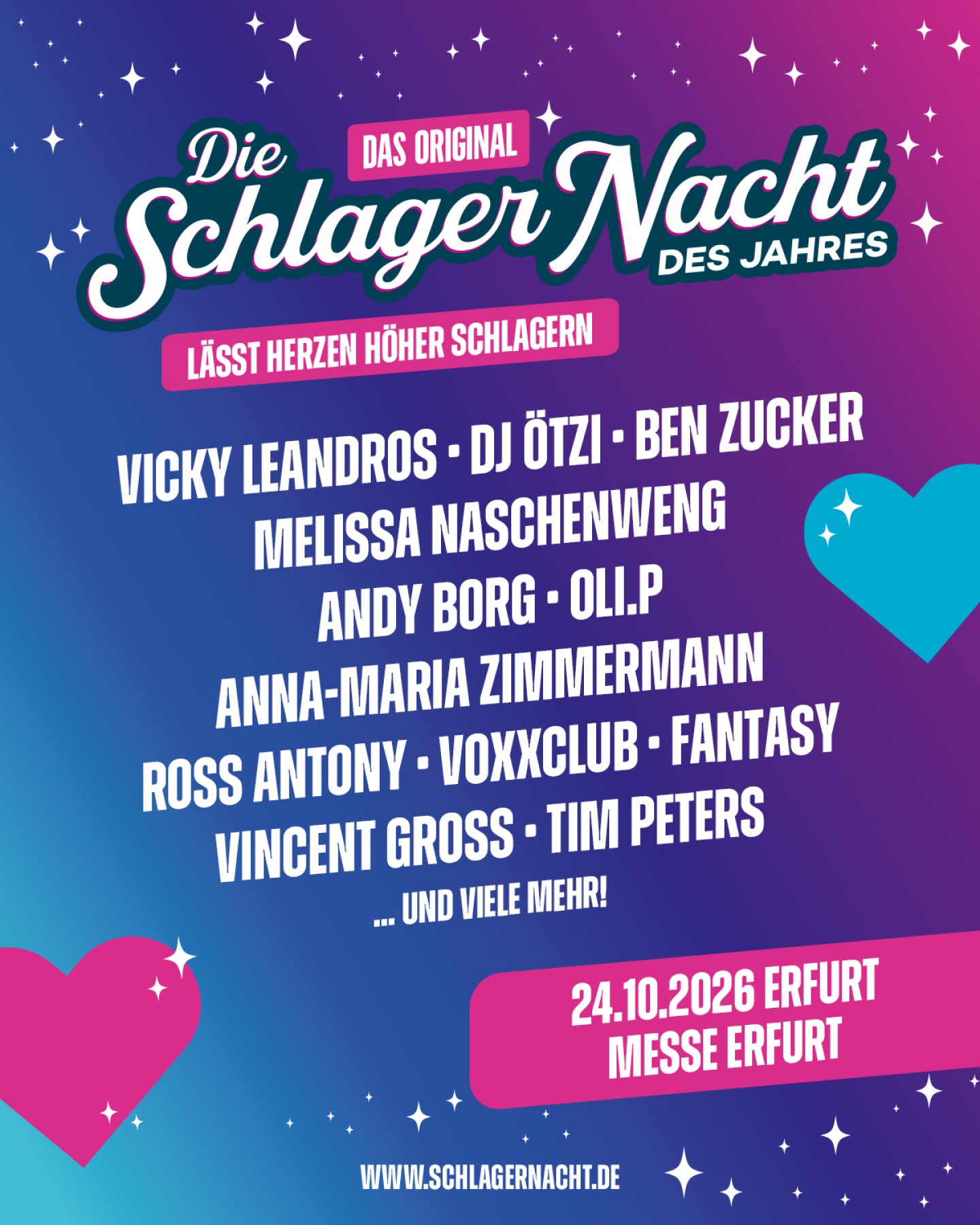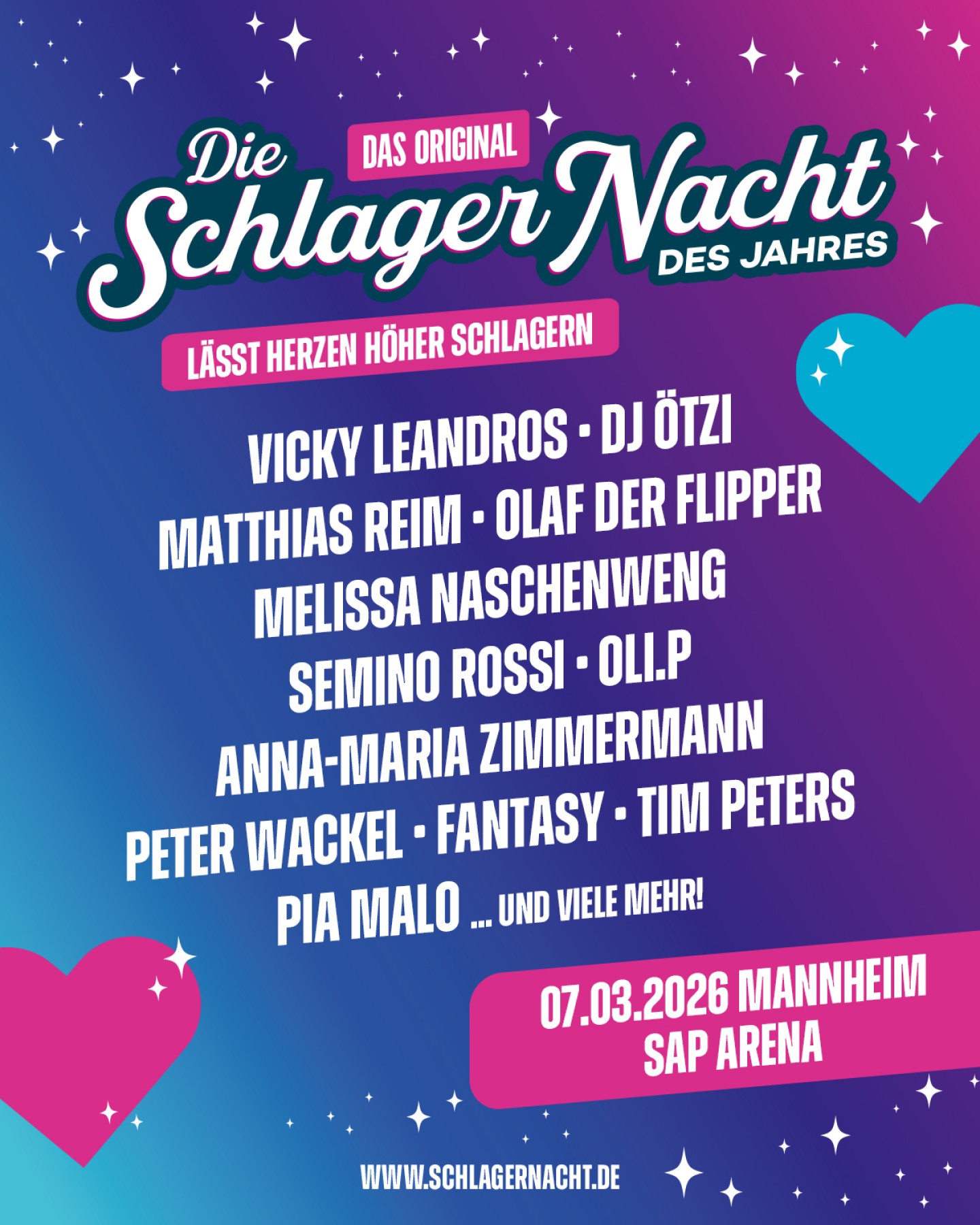 erlebt DAS ultimative Event für Schlagerfans – die Schlagernacht des Jahres – DAS ORIGINAL! Seit über 25 Jahren begeistert die Schlagernacht des Jahres mit einer einmaligen Atmosphäre voller Lebensfreude, Musik und Emotionen. 2025 verspricht, UNSCHLAGRBAR GUT zu werden!